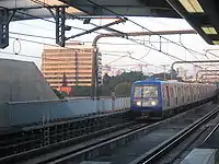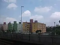 | Conjuntos habitacionais da COHAB em Artur Alvim vistos da janela de um trem do Metrô. Segundo a CPI da Poluição foram detectados nos apartamentos níveis de ruído de 75 decibéis (com picos de 85-90 decibéis) durante a passagem dos trens.[22] | Aspecto de via elevada do Metrô próxima à estação Parada Inglesa. Em meados de 2009, esse trecho recebeu painéis metálicos (vistos à direita) para minimizar o nível de ruído durante a passagem dos trens. | Trem do Metrô passa sobre elevado, no trecho entre as estações Sacomã e Tamanduateí, revestido com barreira acústica para minimizar a poluição sonora causada pelos trens. | Trem do Metrô passa sobre elevado, próximo à Estação Santo Amaro. Alguns trechos da Linha 5–Lilás também receberam painéis metálicos para minimizar o nível de ruído durante a passagem dos trens, já que uma parte da linha é elevada. |