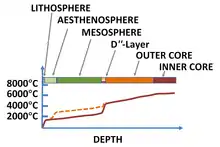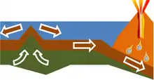 Convecção mantélica é o movimento lento de arrastamento do manto rochoso da Terra causado por correntes de convecção que transportam calor do interior da Terra para a sua superfície.[3] A litosfera da superfície da Terra, que se desloca sobre a astenosfera (as duas componentes do manto superior), encontra-se dividida em várias placas tectónicas que são continuamente criadas e consumidas nos seus limites opostos. À medida que material do manto é adicionado às orlas crescentes de uma placa, dá-se a acreção, geralmente associada à expansão do fundo oceânico. Este material quente adicional arrefece por condução e convecção de calor. Nas margens onde a placa é consumida, o material contraiu-se termicamente tornando-se denso, e afunda-se sob o seu próprio peso no processo de subducção numa fossa oceânica.[4]