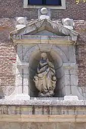 Por cima do frontão do nicho encontra-se o último corpo da fachada com uma janela retangular no centro ladeada por escudos em pedra dos reis Filipe III e Margarida. O conjunto é rematado com uma imposta e um frontão em cujo centro se abre um "olho de boi". Sobre o telhado da esquerda ergue-se uma pequeno campanário com três sinos.