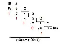 A técnica de divisões sucessivas é utilizada para conversão de números inteiros do sistema decimal para o binário. Esta técnica consiste em dividir o número original pela base 2, o resto da divisão será um dígito e o resultado da divisão é novamente dividido por 2. Esta última etapa se repete até que o resultado da divisão seja zero. Para melhor compreensão do método, a imagem ao lado mostra um exemplo de conversão do número decimal 19 para binário.