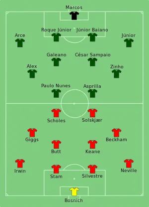 O gol de Roy Keane, aos 35 minutos, veio depois de uma grande jogada de Ryan Giggs pelo lado esquerdo. O galês chegou à linha de fundo, cruzou alto, Marcos saiu mal do gol, pulou para desviar a bola mas não a alcançou, e o meio-campista irlandês chegou para tocar de pé direito para o fundo da rede e marcar.