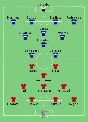 Com a base da equipe campeã da América, o time confiava na força de seu ataque, com Riquelme, Schelotto e Delgado. Mas o time não conseguiu furar a meta do goleiro Oliver Kahn, e ainda teve Delgado expulso ao receber o segundo cartão amarelo no minuto 46 da disputa por simular um pênalti diante de Kahn, ainda sim o restante da partida mesclou equilíbrio e chances de abrir o placar.
