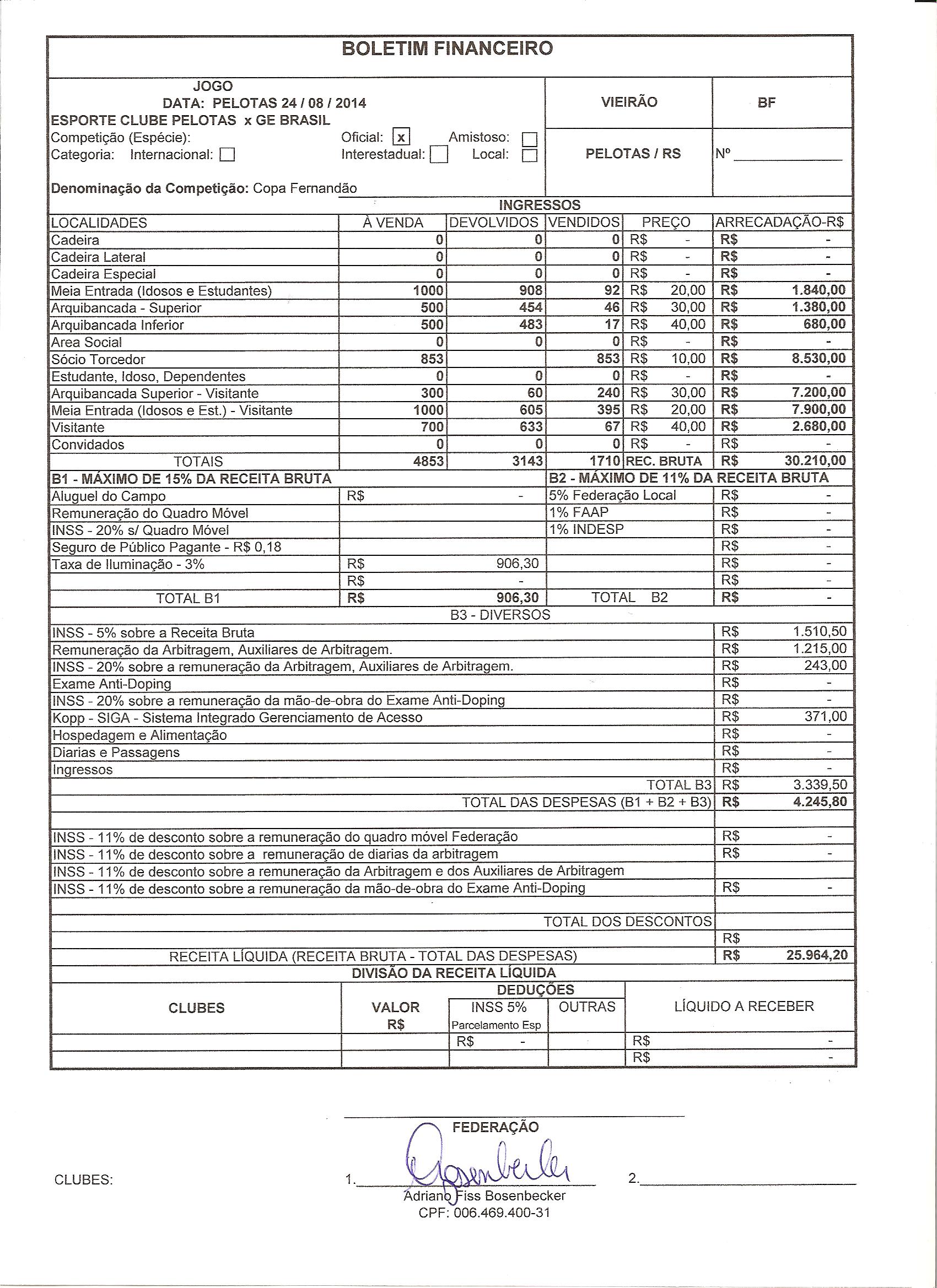 - «Boletim Financeiro (Brasil x Pelotas - 20/08)» (PDF). FGF.com.br. Consultado em 4 de setembro de 2014