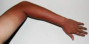 A Escala de Fitzpatrick é um esquema de classificação numérica para cor da pele humana. Foi desenvolvido em 1975 por Thomas B. Fitzpatrick como uma forma de estimar a resposta de diferentes tipos de pele à luz ultravioleta (UV).[25] Foi inicialmente desenvolvido com base na cor da pele para medir a dose correta de radiação ultravioleta para terapia PUVA, e quando o teste inicial baseado apenas em cabelo e cor dos olhos resultou em doses muito altas de UVA para alguns, foi alterado para se basear nos relatos do paciente de como sua pele responde ao sol; também foi estendido para uma ampla gama de tipos de pele.[26][27][28]