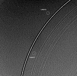 ![]() Imagem de descoberta de Cordélia (indicado pelo círculo de baixo). Imagem da Voyager 2. | |