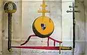 A insígnia de coroação húngara consiste na Coroa Sagrada, é a única que atualmente tem a sua qualificação como um "atributo sagrado", o cetro, o orbe e o manto. A esfera tem o brasão de Carlos I da Hungria (1310–1342); a outra insígnia pode ser ligada a Santo Estêvão.