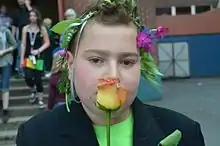 Uma coroa de flores pode ser usada como um headdress feito de folhas, flores e ramos. Ele é tipicamente usado em ocasiões festivas e em dias santos. Coroas de flores foram feitos originalmente para uso com pagan rituais na Europa, e foram associados com a mudança das estações e da fertilidade. Cristianismo aceitou o simbolismo da coroa de flores com base em sua associação romana com a honra e a virtude moral.[13] Durante a Idade Média, a arte cristã contou com representações da Virgin Mary e vários santos coroados com coroas de flores, assim como figuras da mitologia grega e romana foram retratado vestindo coroas de flores, assim como Roman e governantes e heróis gregos.