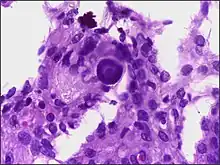 Corpo de psammoma (círculo roxo no centro) em um meningioma.