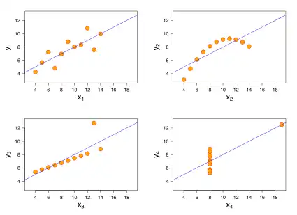 IO coeficiente de correlação de Pearson indica a força de uma relação linear entre duas variáveis, mas seu valor geralmente não caracteriza completamente sua relação.[53] Em particular, se a média condicional de dado , denotado , não for linear em , o coeficiente de correlação não determinará completamente . A imagem ao lado mostra gráficos de dispersão do quarteto de Anscombe, um conjunto de quatro pares diferentes de variáveis criadas por Francis Anscombe. As quatro variáveis têm a mesma média (7,5), variância (4,12), correlação (0,816) e regressão linear.[54] Entretanto, a distribuição das variáveis é muito diferente. De acordo com os gráficos ao lado, o coeficiente de correlação como uma estatística de resumo não pode substituir a análise visual dos dados. Nota–se que os exemplos às vezes indicam que o coeficiente de correlação de Pearson presume que os dados seguem uma distribuição normal. No entanto, isto não é verdade.[55]