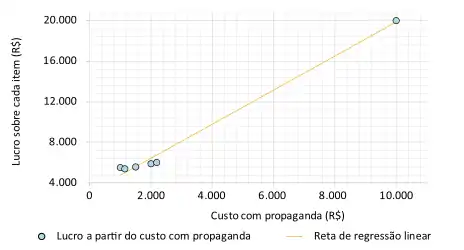 A partir do gráfico de dispersão da tabela acima, encontra–se uma correlação linear que mostra uma tendência entre investimento em propaganda e retorno positivo em vendas. É possível estimar um retorno de vendas com um aumento no custo em propaganda pelo cálculo matricial por meio da equação geral da reta , em que são os valores independentes que correspondem aos custos de propaganda e são os valores de retorno tratados para o cálculo do vetor chamado na tabela A de lucro sobre cada item. Esse cálculo é uma generalização método dos mínimos quadrados.[35]