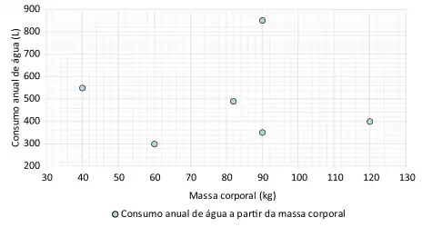 Para se manter saudável, o consumo de água é indispensável. Uma gestora pública solicita à uma consultoria para verificar se há relação entre o consumo de água e a massa corporal de uma pessoa. A tabela B mostra indivíduos que fazem o consumo de água.[36]