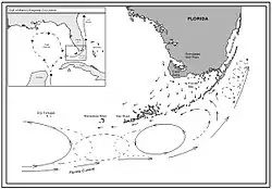 A Corrente da Flórida resulta do movimento da água empurrada do Atlântico para o Mar do Caribe pela rotação da Terra (que exerce uma força maior no equador ). A água se acumula ao longo da América Central e flui para o norte, através do Canal de Yucatán, no Golfo do México. A água é aquecida no Golfo e expulsa pelo Estreito da Flórida, entre Florida Keys e Cuba, e flui para o norte ao longo da costa leste dos Estados Unidos. A Corrente da Flórida é freqüentemente referida de forma imprecisa como Corrente do Golfo. Na verdade, a Corrente da Flórida se junta à Corrente do Golfo na costa leste da Flórida.