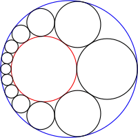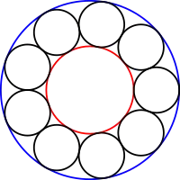 Uma corrente de Steiner de doze círculos pretos (n = 12). Os círculos dados são mostrados em azul e vermelho, que são o círculo interior e exterior, respectivamente.