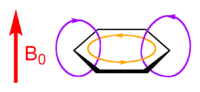 Um diagrama de um corrente de anel aromático. B0 é o campo magnético aplicado, a seta vermelha indica sua direção. O anel laranja mostra a direção da corrente de anel, e os anéis roxos mostram a direção do campo magnético induzido.