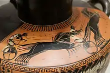 - [d] ^ Um deles é Carroto, que é elogiado por Píndaro por manter sua carruagem ilesa (Píndaro. Pítias, 5.25-5.53). Ao contrário da maioria dos cocheiros, Carroto era amigo e cunhado do homem por quem dirigia, Arcesilau de Cirene; assim, seu sucesso confirmou o sucesso do modo aristocrático tradicional de organização da sociedade[51]