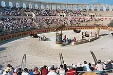 - [e] ^ En Roma, a corrida de bigas constituiu um dos dois tipos de jogos públicos, os ludos circenses. O outro tipo, os ludos escênicos, consistiam sobretudo em apresentações teatrais.[52][53]