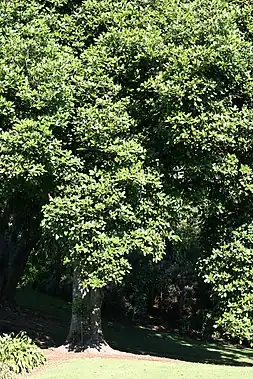 ![]() Folhagem e frutos maduros de Corynocarpus laevigatus. | |||||||||||||||||