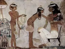 - A mulher: mantinha seu nome, uma certa independência e até mesmo o seu trabalho: como parteiras, tecelãs, médicas, prefeitos, ou como colaborados na empresa de seus maridos. Ao casar, as mulheres adquiriam o status de "nbt pr", que significa administradora do Património e em casa eram elas que organizavam tudo. Prestavam muita atenção à sua aparência, principalmente com o penteado e a maquilhagem. Nas pinturas, a pele dos homens aparece mais morena enquanto as mulheres de classe superior tinham um tom de pele mais pálido. Acredita-se que a diferença na cor da pele pode indicar posição elevada da pessoa, ou pode indicar que essa se abrigava mais do sol em casa, ou que utilizava de vários cosméticos para adquirir tal cor. Outras versões (discutíveis) indicam que era um símbolo de pureza, beleza e de inactividade, por respeito aos homens, sendo esses sempre representadas com um tom de pele mais escura.