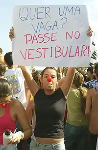 Em 29 de agosto de 2012, é sancionada a Lei nº 12.711, que define quotas reservadas para estudantes que tenham cursado integralmente o ensino médio em escolas públicas e oriundos de famílias com renda igual ou inferior a um e meio salário-mínimo assim como por pessoas autodeclaradas pretas, pardas e indígenas e por pessoas com deficiência no ingresso em cursos de gradução, constituindo, portanto um sistema de quotas misto que contempla questões sociais, econômicas e raciais.[35] Foi posteriormente regulamentada pelo Decreto nº 7.824, de 11 de outubro de 2012 que detalhou os critérios de seleção a serem aplicados para os cotistas.[36] Ambos instrumentos legais acabaram conhecidos como "Lei das Cotas".[37][38][39]