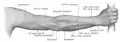 No ser humano, as veias superficiais na curva do cotovelo são conspícuas e formam um 'M', no qual as hastes direitas são as veias radial e ulnar, enquanto que a haste oblíqua externa é a veia média cefálica e a interna a veia média basílica.[1]