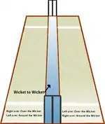 Uma extremidade do pitch é designada a atividade de rebater (batting) onde o batsman se posiciona, e a outra é designada a atividade de bolear, ou bowling (na qual o boleador, ou bowler, arremessa). A área do campo ao lado da linha a qual o batsman segura seu taco (o lado da mão direita é chamado para o jogador destro, o esquerdo para o canhoto) é conhecido como off-side, enquanto o outro lado é chamado de leg-side ou on-side.[15]