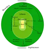 A maioria das ações tem lugar no centro do campo, em uma faixa retangular de barro batido ou grama baixa chamada pitch, cuja medição é de 3,05 m × 20,12 m (10 × 66 pés).