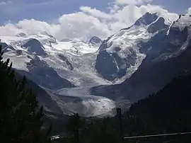 Panorama de Diavolezza. Da esquerda para a direita: Piz Palü, Bellavista, Crast' Agüzza (pequeno pico rochoso no meio), Piz Bernina e Piz Morteratsch