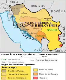 O novo reino foi formado a partir dos antigos Estados independentes monárquicos do Reino da Sérvia e o Reino de Montenegro, bem como uma quantidade significativa de território que tinha sido anteriormente parte do Império Austro-Húngaro. As terras da Áustria-Hungria que formaram o novo estado incluíam a Croácia-Eslavônia e Voivodina da parte húngara do império, Carniola, parte da Estíria e da Dalmácia do lado austríaco, além da província imperial da Bósnia e Herzegovina que tinha sido governada conjuntamente pelas duas metades do império.