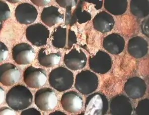 - Nos favos onde as larvas mortas estão secas, forma-se uma escama. Observando o favo com a cabeça para baixo, contra o sol é facilmente identificável, que ficam aderidas longitudinalmente à parede das células do favo. Eles são de cor castanho muito escuro, quase preto, muito difícil de remover.