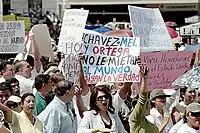 Grande parte da oposição ao governo de facto de Micheletti e suas ações foram coordenadas através de uma ampla coalizão de organizações grassroots e partidos políticos e movimentos anteriormente conhecidos como Frente Nacional de Resistencia Contra el Golpe de Estado (FNGE), atualmente Frente Nacional de Resistência Popular.[87] A FNGE pretendia restaurar o presidente eleito Manuel Zelaya em substituição ao governo de facto de Roberto Micheletti,[88][89] que foi percebido pelas organizações participantes como uma ditadura, considerando as violações documentadas dos direitos humanos[90] desde o golpe de Estado e o reaparecimento de figuras envolvidas em desaparecimentos e tortura[91] no golpe de Estado anterior. A FNGE apoiava um processo de democracia participativa que deveria conduzir a uma assembleia constituinte nacional.[92]