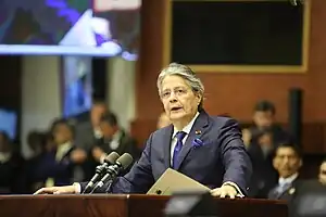 ![]() Lasso comparecendo perante a Assembleia Nacional do Equador durante o processo em 16 de maio de 2023, um dia antes de invocar a muerte cruzada | |||||||||