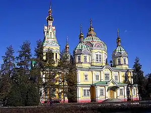 Os ortodoxos representam 21,4% da população do país.[5] A maioria dos cristãos são ortodoxos de origem russa, ucraniana ou bielorrussa. A ortodoxia é reconhecida como uma das duas religiões principais no Cazaquistão, juntamente com o Islão sunita. Apesar do declínio demográfico da comunidade de língua russa, a Igreja ortodoxa tem tido certo dinamismo desde 1989 e o número de igrejas tem aumentado consideravelmente desde 1989 (de 90 para 300), incluindo a Catedral da Assunção, em Astana, inaugurada em 2006.[6] Algunas são de grande interesse patrimonial, como a Catedral da Ascensão, em Almati, construida em 1904 e inteiramente de madeira.