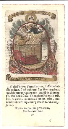 Reportou que enquanto seu corpo jazia no caixão sendo velado pelos concidadãos, sua alma foi levada ao Inferno, ao Purgatório e ao Paraíso e relatou sua experiência de quase morte, testemunhando tudo o que se passou consigo nesses estados. Afirmou que assim que sua alma foi separada de seu corpo, os anjos a conduziram para um lugar muito sombrio, inteiramente cheio de almas cujos tormentos que ali padeciam eram tais que eram impossíveis de descrever. Ela alegou que lhe foi oferecida a possibilidade de permanecer no céu ou retornar à terra para realizar penitência e libertar almas das chamas do purgatório. Cristina concordou em escolher voltar à vida e ressuscitou naquele instante. Ela verbalizou explicitamente aos que estavam ao seu redor que retornara à vida com o único propósito de sofrer pelo alívio dos fiéis defuntos e converter os pobres pecadores.