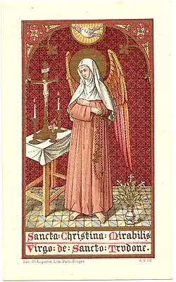 Christina nasceu em uma família religiosa, a caçula de três filhas. Depois de ficar órfã aos quinze anos, ela trabalhou como pastora de animais, levando o rebanho para o pasto. No entanto, quando tinha 20 anos, sofreu uma forte crise epiléptica, e essa condição de convulsão mostrou-se tão grave que acabou em Catalepsia patológica onde as testemunhas presumiram que ela havia morrido de fato. Assim, realizou-se um funeral, mas durante a missa de corpo presente, ela se levantou do caixão cheia de vigor, estupefata e assombrando toda sua cidade de Sint-Truiden que presenciara essa maravilha. Naquele instante levitou, sob olhar atento dos presentes, até o teto da Igreja, quando, sob a ordem do padre oficiante, desceu próximo ao altar e explicou que não suportava o mau cheiro das pessoas pecadoras que estavam ali no recinto.