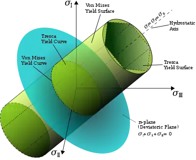 Também mostrado na figura está o critério da máxima tensão cisalhante de Tresca (linha tracejada). Observar que a superfície de escoamento de Tresca é circunscrita pela de von Mises. Portanto, a mesma prediz escoamento plástico para estados de tensão que são ainda elásticos de acordo com o critério de von Mises. Para modelos para comportamento material plástico, o critério de Tresca é portanto mais conservativo.
