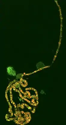 Cromossomos politênicos são grandes cromossomos que foram desenvolvidos a partir de padrão de cromossomos e são comumente encontradas nas glândulas salivares de Drosophila melanogaster. Células especializadas submetem-se a repetidas rodadas de replicação do DNA , sem a divisão celular (endomitosis), formando um cromossomo politênico gigante. Cromossomos politênicos formam-se quando várias rodadas de replicação produzem muitas cromátides irmãs que permanecem fundidas.