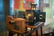 - 1850 - Com a popularização do processo fotográfico, através do daguerreótipo, a partir de 1850 as câmeras conhecem inovações. As simples caixas rígidas de madeira e de foco fixo dão lugar a câmeras que permitem regular o foco, primeiro por meio de duas caixas de madeira interconectadas que podem ser afastadas umas das outras, e depois por meio de foles ligando a objetiva à câmara onde o filme é exposto.[20]