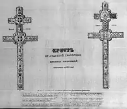 Eufrosina, madre superiora do Convento de Polotsk, encomendou a cruz para decorar a nova Igreja da Transfiguração. A cruz simples de cipreste era decorada com ouro, pedras preciosas e esmalte, e mostrava Jesus Cristo, João Batista, Teótoco (a Virgem Maria), os Quatro Evangelistas, os arcanjos Gabriel e Miguel, além dos três santos padroeiros de Eufrosina e de seus pais. A obra custou, à época, 120 hryvnas. Dentro da cruz estavam pedaços da Santa Cruz e outras relíquias.