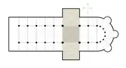 O braço maior (e, às vezes, o menor) é geralmente dividido em várias naves, geralmente um número ímpar, com a nave central se destacando como a principal e as naves laterais tendo altura menor. Essas naves laterais podem se estender além do cruzeiro e circundar o altar principal, em um espaço conhecido como deambulatório. Os muros da igreja podem ser articulados por meio de capelas laterais. Na cabeceira da igreja, pode haver um ábside semicircular (geralmente coberto com uma exedra - meia cúpula) que pode ser complementado com absidiolos adjacentes, seja ao próprio ábside, seja ao braço menor.