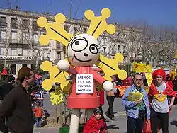 A cruz occitana amarela sob um fundo vermelho, com a estrela do Felibritge de sete pontas acima à direita, é a bandeira moderna da Occitânia.