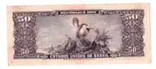 5 Cruzeiros "cédula do índio"[6] | Frente: Efígie de um índio e uma jangada. Verso: Vitória régia Dimensões: 156 x 67 mm. |
