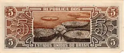 5 Cruzeiros "cédula do índio"[6] | Frente: Efígie de um índio e uma jangada. Verso: Vitória régia Dimensões: 156 x 67 mm. |
