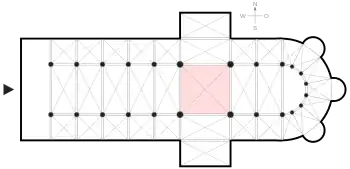 Representação esquemática de uma planta de catedral. O cruzeiro é a área marcada em rosa.
