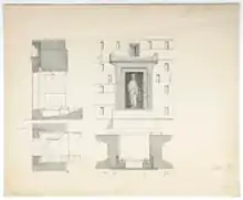 A porção inferior do edifício é constituída por uma fundação massiva, sobre a qual, numa altura de 6,35 metros, há uma câmara. Esta câmara interior quadrada de 5,70 metros de altura por 3,70 metros de largura é acessada através de uma porta no muro norte com um lintel decorado na porção superior da torre; as duas janelas falsas deste muro estão centradas e verticalmente alinhados abaixo do lintel. A câmara foi originalmente acessada por um lance de escadas, da qual apenas a porção inferior sobreviveu. A porta de 1,70 metro de largura por 1,90 metro de altura era de pedra sólida e esteve originalmente firmemente fechada, mas agora está desapareceu; para Friedrich Krefter a entrada possuía inserções para duas portinholas. A partir de uma altura de 3 metros em diante, as fachadas são decoradas com 15 fileiras, 16 no caso do muro norte, de recuos retangulares pouco profundos e estreitos.[1]