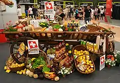 Grande parte dos pratos feitos na culinária e gastronomia suíça são feitos à base de batata, queijos, cogumelos e ingredientes de pequenos agricultores rurais. A proximidade geográfica de Itália, Alemanha e França influencia diretamente e muitos pratos estão relacionados com a culinária destes países.[29] Embora muitos pratos tenham sido criados nestas regiões adjacentes, podem ser também considerados partes integrantes da culinária suíça, incluindo o Crepe, a Polenta, a Raclette e o Risotto.