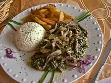 - Ndolé (um guisado picante contendo folhas verdes, carne, camarão, casca de porco e pasta de amendoim)