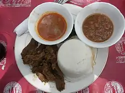 Muitos pratos incluem vários vegetais, batatas, inhame, banana e outras frutas tropicais. Frango, porco, peixe (geralmente fresco, mas também há uma variedade seca, reconstituída para guisado),[1] carne de vaca, cabra e carneiro são todos comumente consumidos, embora entre os pobres rurais, as carnes sejam consumidas menos do que em outras áreas, e principalmente comido na forma de carne de caça. Nyama é a palavra da língua bantu para "carne".