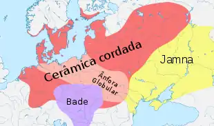 A anterior cultura do vaso campaniforme teria derivado do extremo ocidental desta cultura, na zona dos atuais Países Baixos, onde grupos da "cultura da cerâmica cordada" aproveitaram os seus contatos e comunicações marítimas e fluviais e começaram uma diáspora. Enquanto este grupo adotou uma grande variedade de elementos novos (como o álcool, os cavalos, a metalurgia, a roupa de lã) e mudaram o machado de guerra pelo arco, na Escandinávia e nas planícies do norte da Europa continuaram com as suas tradições locais.