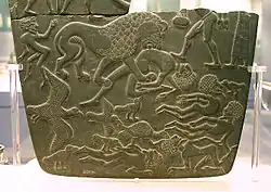 Outro grafite de Gebel Xeique Solimão e duas cabeças de clavas pertenceram ao rei Escorpião II. Evidências apontam que ele tentou unificar militarmente o Egito, mas conseguiu apenas ampliar seus domínios até Mênfis. O reinado do governante seguinte, Narmer, é caracterizado por marcante evolução em diversos aspectos culturais egípcios.[87] Segundo teorias clássicas, foi durante seu reinado que o Egito unificou-se,[88] tendo sido considerado como o primeiro rei dinástico;[89] foi possivelmente o único a terminar a contínua rivalidade dos líderes abideno-tinitas com aqueles de Hieracômpolis, presumivelmente através do reconhecimento da autoridade da última com concessões do rei às famílias locais poderosas.[85] Em Hieracômpolis foram identificados diversos artefatos pertencentes a Narmer, entre eles sua cabeça de clava, sua paleta e um cilindro de madeira com decoração incisa.[86]