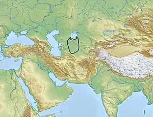 ![]() Localização aproximada da área onde existiu a cultura de Tazabagyab. Ficava a leste do mar Cáspio, a sul pelo mar de Aral e era atravessada pelo rio Amu Dária. | |